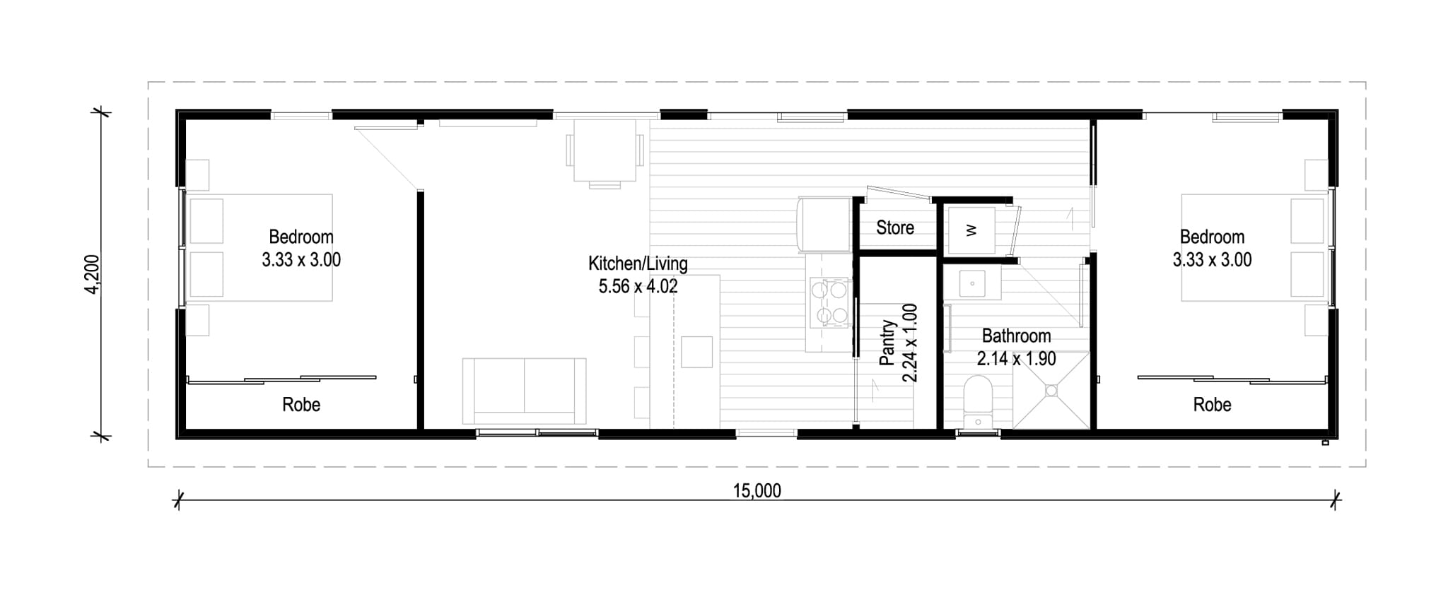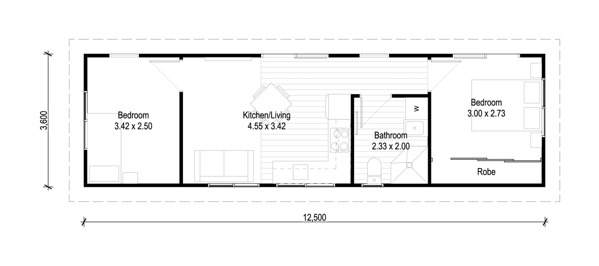 - Pre-set layout with open-plan living, kitchen and bathroom